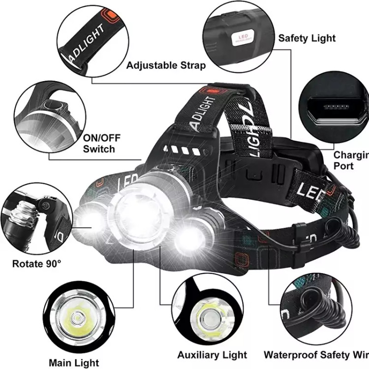 چراغ پیشانی شارژی LED، لامپ ضد آب IPX4 فوق العاده روشن، چراغ قوه چراغ قوه 4 حالته 3 LED قابل تنظیم برای بزرگسالان کمپینگ، دویدن، کارهای خانگی