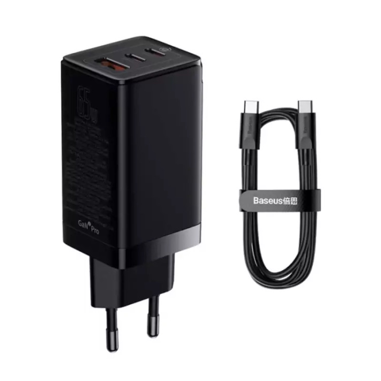 شارژر سریع جهانی GaN Baseus GaN3 Pro 2 x USB Type C / USB 65W PD3.0، QC4.0 +، AFC مشکی + USB نوع C - کابل USB نوع C 1 متر (CCGP050101)