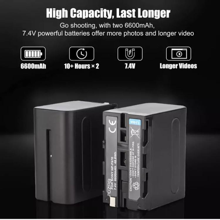ظرفیت بالا 6600 میلی آمپر ساعت (ظرفیت واقعی)، 7.4 ولت، 4.84 وات ساعت. باتری جایگزین لیتیوم یونی برای سونی NP-F970, NP-F960, NP-F950, NP-F930, NP-F570, NP-F550, F530, F330 به شما امکان می دهد تا حداکثر 10 ساعت فیلمبرداری فیلمبرداری کنید. لحظه فوق العاده