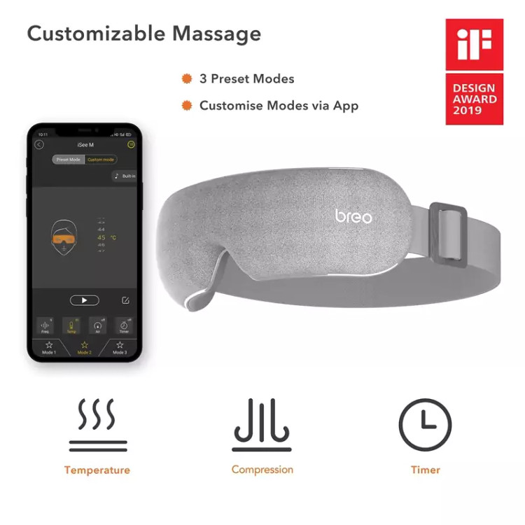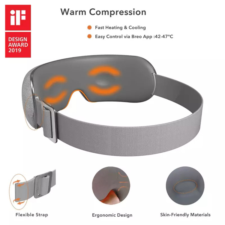 ماساژ و موسیقی قابل تنظیم: لطفاً برنامه «breo» را در فروشگاه Google Play یا App Store برای سفارشی کردن ماساژ نصب کنید. از ماساژ چشم آرامشبخشتری با موسیقی، حجم، شدت و گرمای قابل تنظیم خود لذت ببرید.