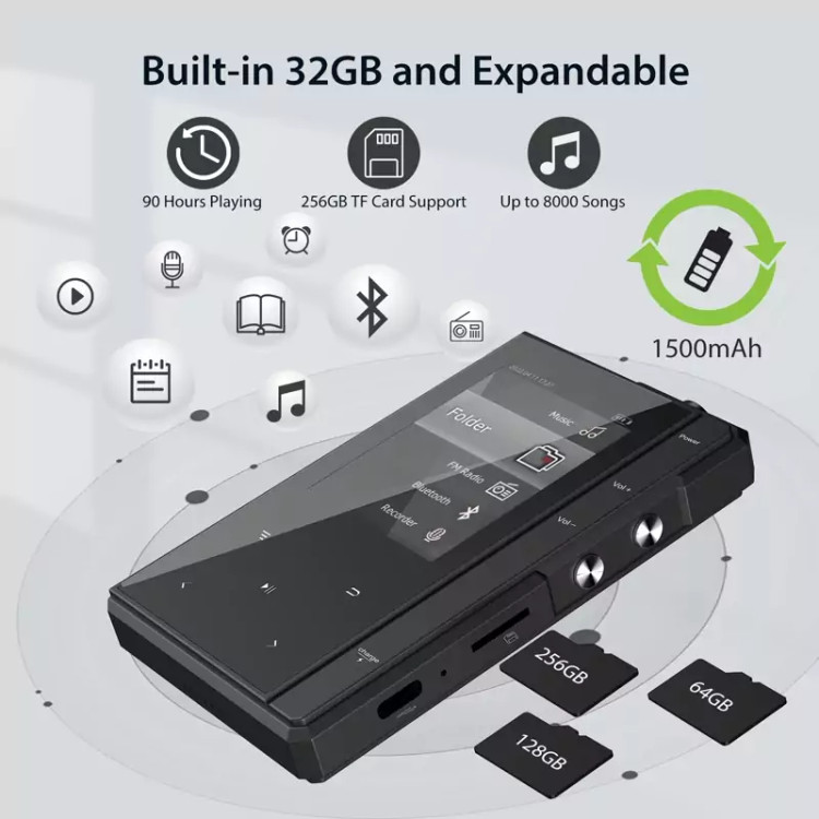 -MP3 Player با بلوتوث 5.0: بلوتوث پیشرفته 5.0 سازگاری بهتر و اتصال پایدار را امکان پذیر می کند، از این پس از موسیقی خود بدون نگرانی در مورد سیگنال متناوب بلوتوث لذت ببرید. نکات: عملکرد بلوتوث فقط از اتصال هدفون/بلندگو/صدای ماشین بلوتوث پشتیبانی می کند.