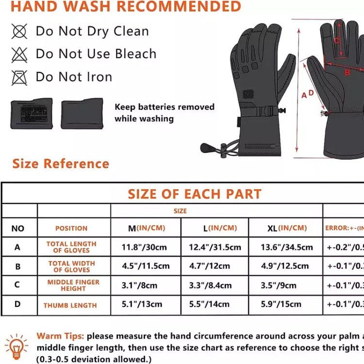 توضیحات محصول دستکش های گرمکن EEIEER 7.4 ولت 5000 میلی آمپر ساعتی دست های یخ زده شما را آزاد می کنند. عناصر گرمایشی بهبود یافته: به سادگی بخاری را با لمس یک دکمه روشن کنید و دستان شما برای تفریح زمستانی، صرف نظر از دمای سرد یا زیر صفر، آماده هستند. فویل حرارتی: سیم گرمایش نانوالیاف، گرمایش سریع، مصرف انرژی کم، مقاومت در برابر شستشو، مقاومت در برابر کشش، مقاومت در برابر اصطکاک، ایمنی و ولتاژ پایین. این دستکشها دارای یک سیستم گرمایشی با باتری 7.4 ولتی 5000 میلیآمپر ساعتی هستند که به صورت ارگونومیک در پشت دست قرار گرفته و پنج انگشت به نوک انگشتان میرسد. علاوه بر گرمایش با باتری، دارای پنبه با کیفیت 3M است تا گرمای مورد نیاز شما را فراهم کند، حتی بدون سیستم گرمایش هنوز هم یک جفت دستکش زمستانی با کیفیت بالا است. محافظ ضد آب و تنفس. میکروفیبر نه تنها بادوام است، بلکه با صفحه نمایش لمسی نیز سازگار است. بنابراین می توانید عکس بگیرید یا به تماس ها پاسخ دهید بدون اینکه دست خود را در معرض سرما قرار دهید. ایمن تر با محافظت در برابر تخلیه بیش از حد، شارژ بیش از حد، گرمای بیش از حد و اتصال کوتاه. نشانگر شارژ هنگام شارژ به رنگ قرمز روشن می شود. هنگامی که باتری تقریباً 90 درصد شارژ می شود، چراغ نشانگر شارژ به رنگ نارنجی می درخشد. هنگامی که به طور کامل شارژ شود، نشانگر شارژ به رنگ سبز روشن می شود. شستشوی دستی و ماشین لباسشویی پشتیبانی می شود، برای شستشوی ماشینی بهتر است در یک کیسه لباسشویی قرار دهید. 6-12 ساعت زمان گرمایش طولانی + 5 درجه حرارت گرمایش + باتری 7.4 ولت 5000 میلی آمپر ساعت.
