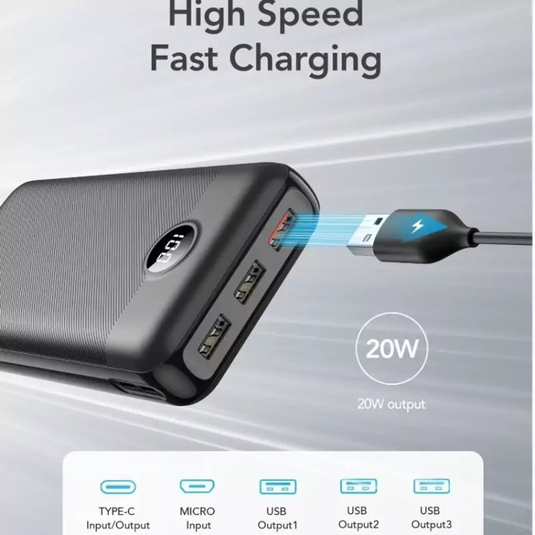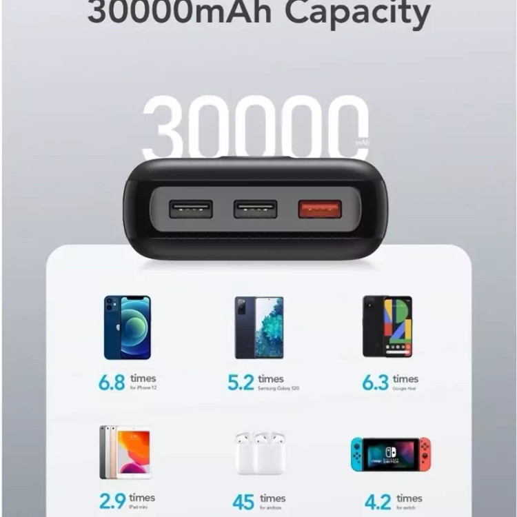 این شارژر قابل حمل با طراحی چند پورت شامل 3 پورت خروجی USB-A و یک درگاه خروجی نوع C. ارائه راه های متعدد برای شارژ مجدد، از جمله پورت دو طرفه Micro و Type-C. این پاوربانک 30000 میلی آمپری می تواند تقریباً تمام نیازهای شارژ را در زندگی روزمره شما برطرف کند.
