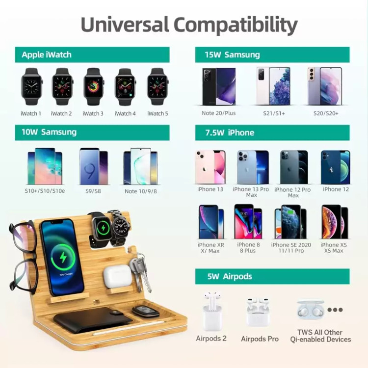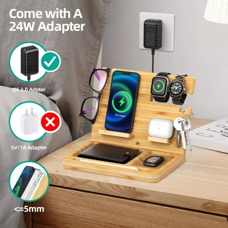 ایستگاه اتصال تلفن بامبو، ایستگاه شارژ بیسیم OTESS 6 در 1 سازگار با iPhone/AirPods، سازماندهنده میز تخت خوابشو با نگهدارنده کلید، پایه کیف کیف و سازماندهنده ساعت، بهترین هدیه برای مردان/پدر/شوهر