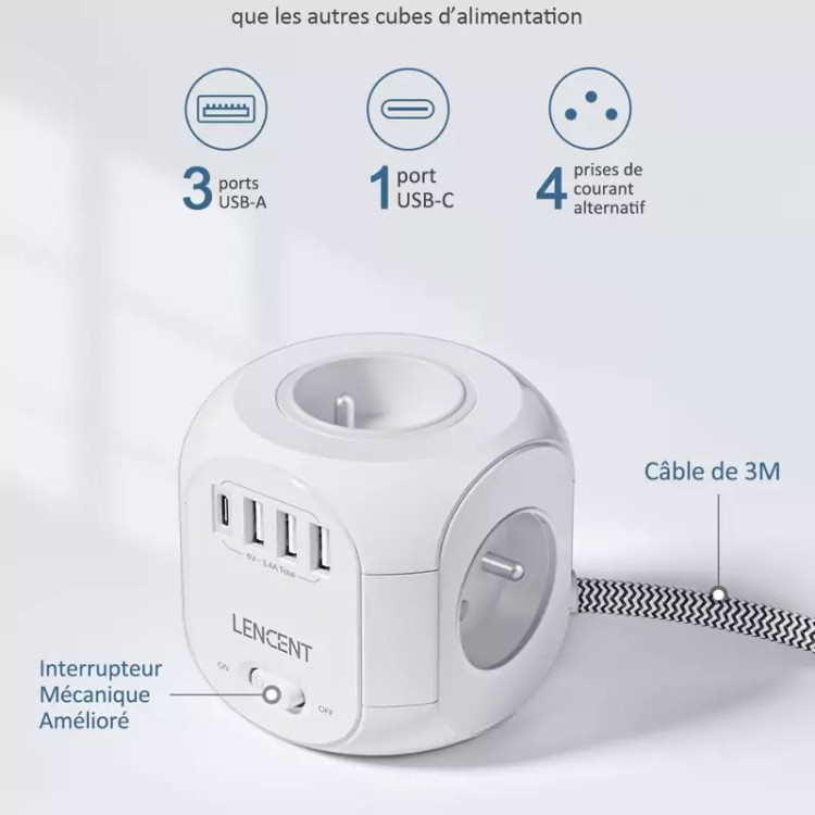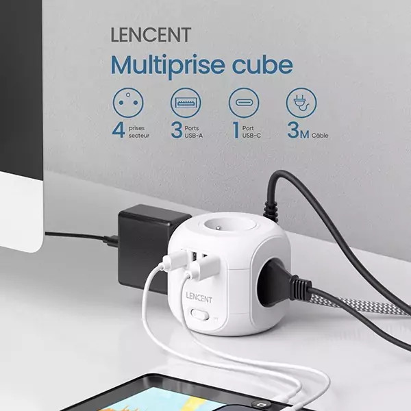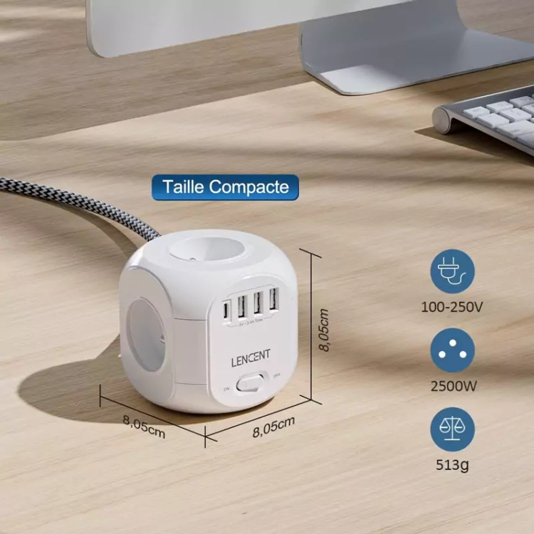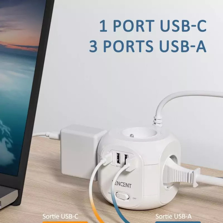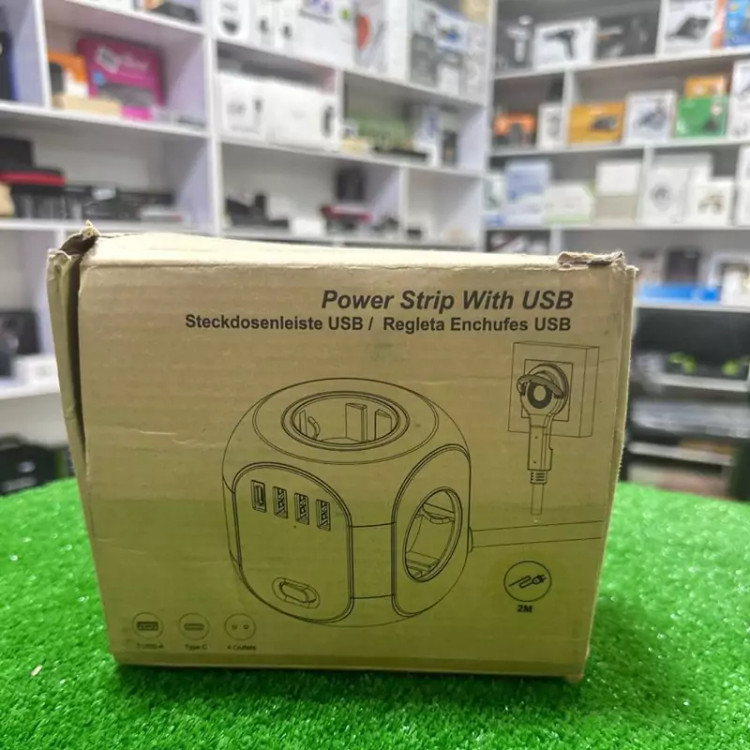 نوار تغذیه کابل پسوند مکعبی 8 در 1 شامل 4 سوکت + 3 پورت USB + 1 پورت TypeC است.