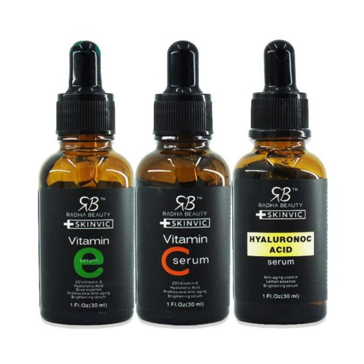 پک کامل یعنی شامل سه سرم میباشد : صاف کننده و درخشان کننده پوست : حجم هر سرم ۳۰ میلی لیتر : سرشار از مواد مغذی و معدنی، جهت جوانسازی پوست صورت سرم ویتامین E سرم ویتامین ای E از ست سرم تخصصی صورت رادا بیوتی دارای مقادیر چشمگیری از ویتامین E میباشد که از التهابات پوستی کاسته و التیام میبخشد. این سرم با رفع چین و چروکهای پوستی از پیری صورت شما جلوگیری میکند و پوست صورت را صاف و نرم خواهد کرد. سرم ویتامین E رادا بیوتی Radha Beauty Vitamin E Serum دارای خاصیت آبرسانی قوی و مرطوبکنندگی بسیار خوبی دارد و پوست خشک صورت را درمان خواهد کرد. سرم هیالورونیک اسید سرم اسید هیالورونیک از ست سرم حرفهای صورت Radha Beauty حاوی مواد معدنی فعال و با جرم مولکولی بسیار کم میباشد که قدرت جذب بسیار بالایی را برای شما مهیا میکند. از مهمترین خواص سرم اسید هیالورونک رادا بیوتی میتوان به اثر ارتجاعی و پرکنندگی سلولهای پوستی اشاره کرد که میتواند از بهترین گزینه ها برای جوانسازی پوست صورت باشد. سرم ویتامین C سرم ویتامین سی C از ست سرم تخصصی صورت رادا بیوتی Radha Beauty Vitamin C Serum سرشار از ویتامین سی C طبیعی و مغذی است که به تنهایی خود یک دکتر پوست برای شما میباشد که اعمالی مانند جوانسازی، تقویت روزانه صورت، بالا بردن عمل کلاژن سازی و سفت کردن پوست انجام میدهد. روش مصرف این محصول چگونه میباشد؟ پس از پاکسازی پوست، مقدار مناسبی از پک سرم صورت سه عددی رادها بیوتی ویتامین C و E و هیالورونیک اسید را روی پوست خود ریخته و با انگشتان تمیز دست خود آن را به حالت دورانی و چرخشی به خوبی ماساژ دهید تا جذب پوست شود. با چشم ها تماسی نداشته باشد.