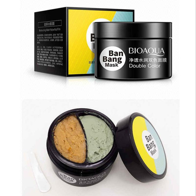 ماسک Ban Bang بیواکوا شامل دو قسمت ميباشد قسمت سبز سبزيجات خنك كننده و آنتى اكسيدان شامل چاى سبز نعنا گل كلم و برگ مليسا است كه مخصوص قسمت تيزون صورت مى باشد و قسمت زرد رنگ آن حاوى مواد مغذى مانند روغن بادام آووكادو پاپايا و نوعى گياهان وحشى ميباشد و مخصوص بقيه صورت است و اين ماسك به صورت تركيبى استفاده ميشود.