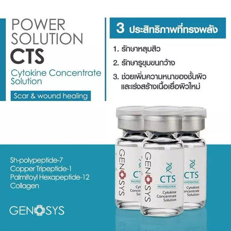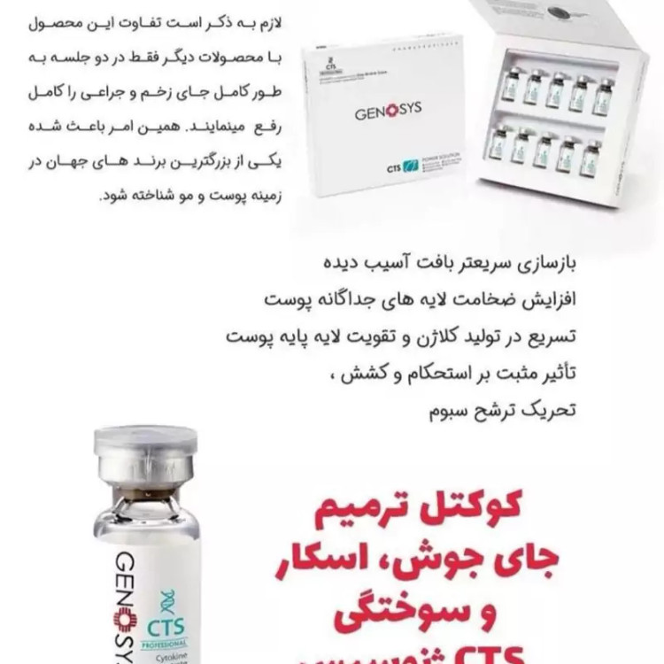 کوکتل ترمیم جای زخم و اسکار و سوختگی CTS ژنوسیس یک محلول 2 میلی بسیار غلیظ است که به تحریک بازسازی بافت کمک میکند و همچنین به پوست کمک میکند خاصیت ارتجاعی طبیعی خود را حفظ کند و استحکام پوست را افزایش دهد.
