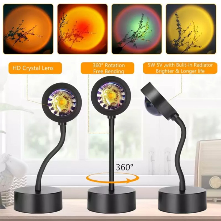 چراغ غروب با کنترل از راه دور پرتاب نور غروب آفتاب توسط USB، یک کابل با دکمه سوئیچ و یک کابل USB به طول 1.5 متر تغذیه می شود. این نور غروب می تواند 180 درجه بچرخد و به شما امکان می دهد آزادانه زاویه را تنظیم کنید. می تواند نور متفاوتی را از زوایای مختلف تولید کند و جلوه های متفاوتی را به اتاق شما بیاورد
