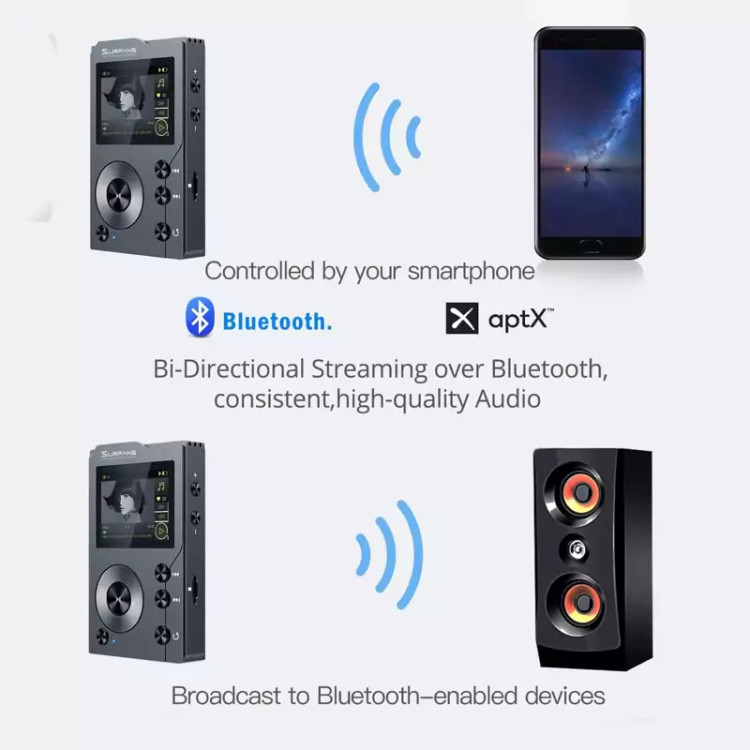 بلوتوث دو جهته: این پخش کننده صوتی با وضوح بالا دارای ویژگی بلوتوث V4.0 برای ارتباط است که زندگی شما را تغییر میدهد، انتقال بلوتوث بیسیم دو طرفه با پروتکل APT-X. پخش کننده موسیقی می تواند به دستگاه های دارای بلوتوث مانند هدفون، بلندگو و غیره پخش شود. و همچنین می تواند یک گیرنده بلوتوث باشد